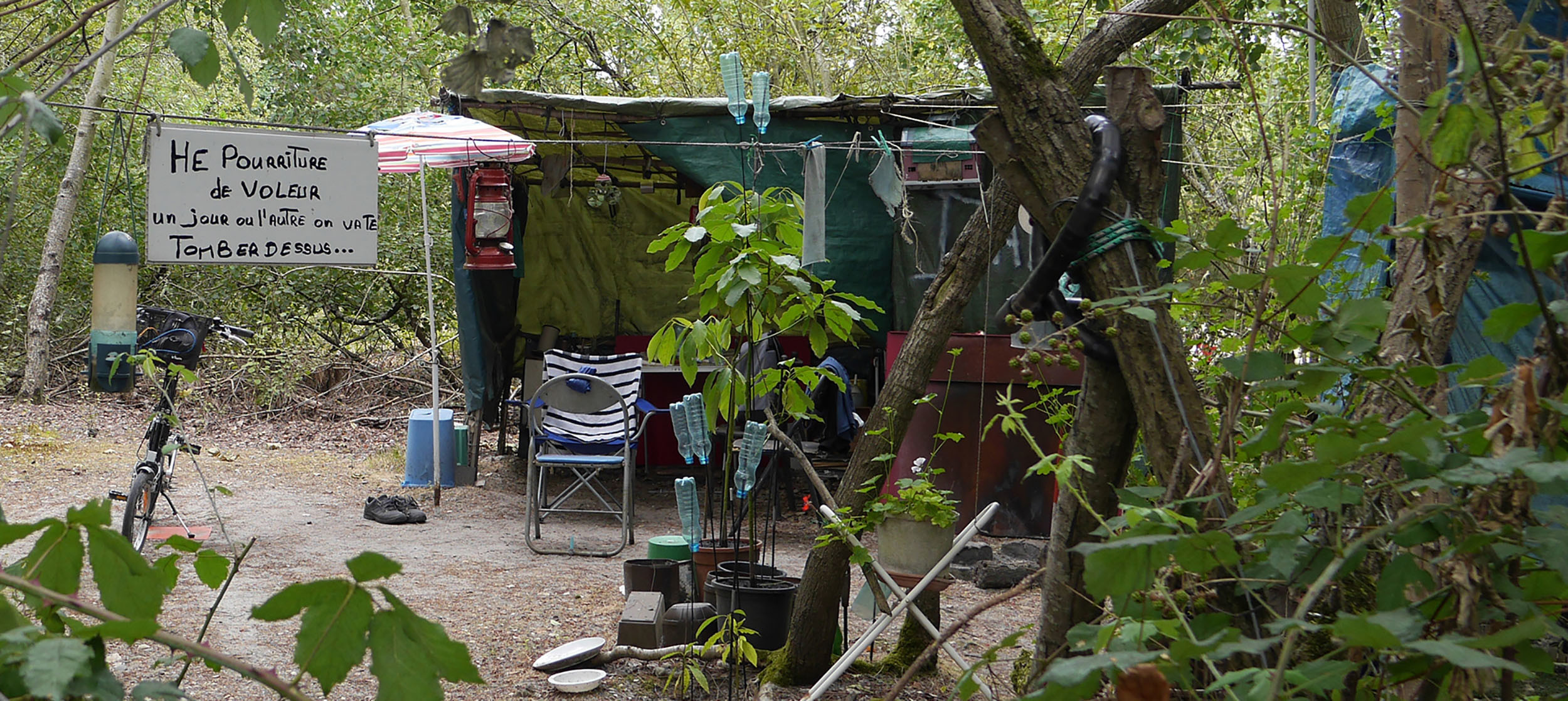 A l’extrémité de la digue qui permet à la rocade de traverser le lac de Bordeaux, loin des regards, une petite communauté de sans abris avaient construit sous les peupliers et au bord de l’eau un village de forture avec terrasse, grande tablée, cuisine, chambres individuelles… Un site sous alarme canine pour prévenir toute intrusion : un chemin de chaines auquel étaient reliées 2 motos ceinturait leur installation.