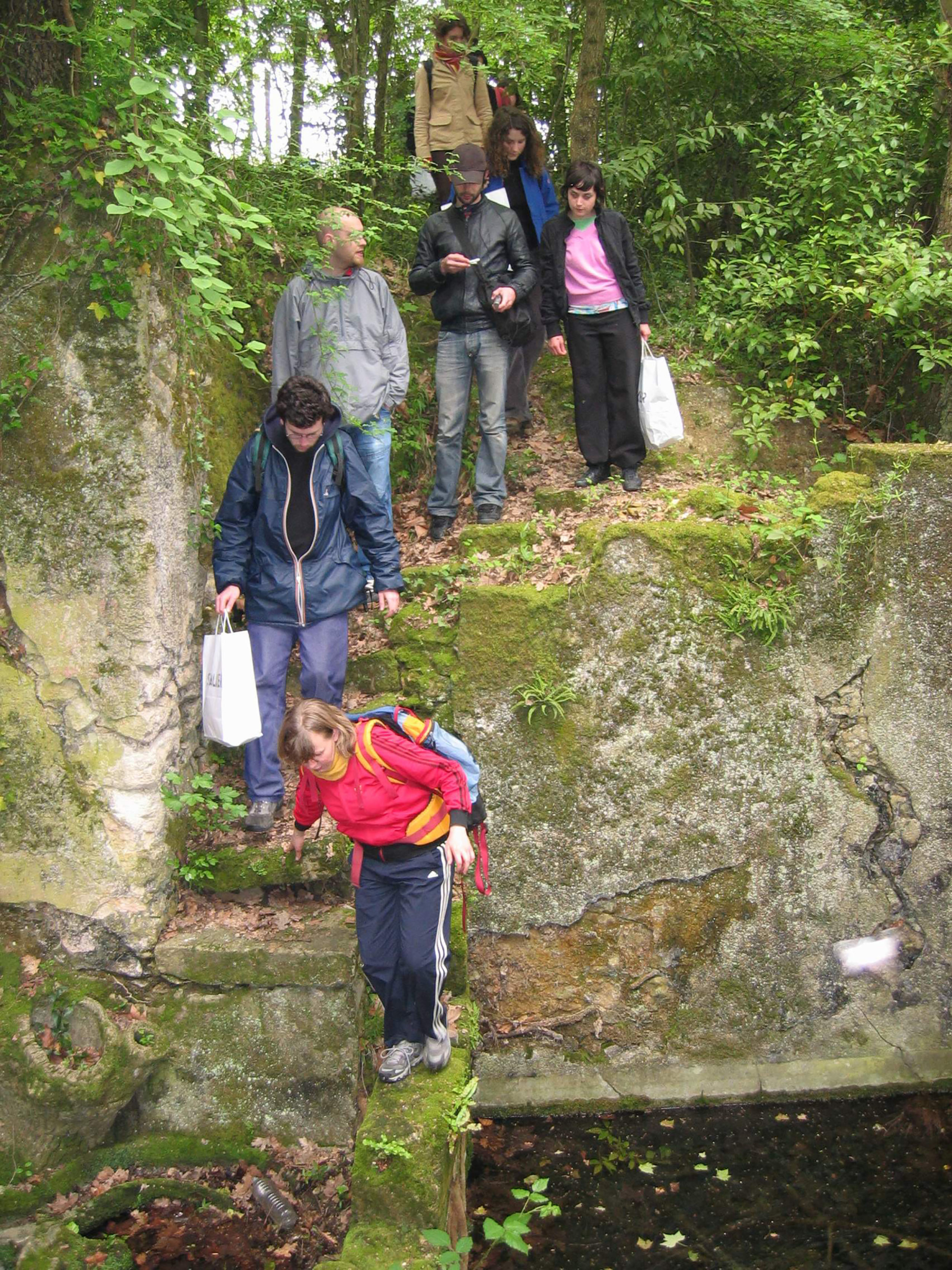 Un micro sentier dans le parc de l’ermitage surplombant les cours arrières des immeubles XIXème des quais. Un vieille dame avec une corneille sur l’épaule nous aperçois, intriguée. La discussion s’engage. Elle nous explique qu’il s’agit d’un cul-de-sac et nous invite à rejoindre les quais en passant par chez elle. Nous descendons une échelle puis rentrons dans son immeuble par le 2ème étage de l’immeuble pour rejoindre le RDC. 60 randonneurs dans un appartements, une trainée de guano dans le dos de sa propriétaire… Surréaliste !