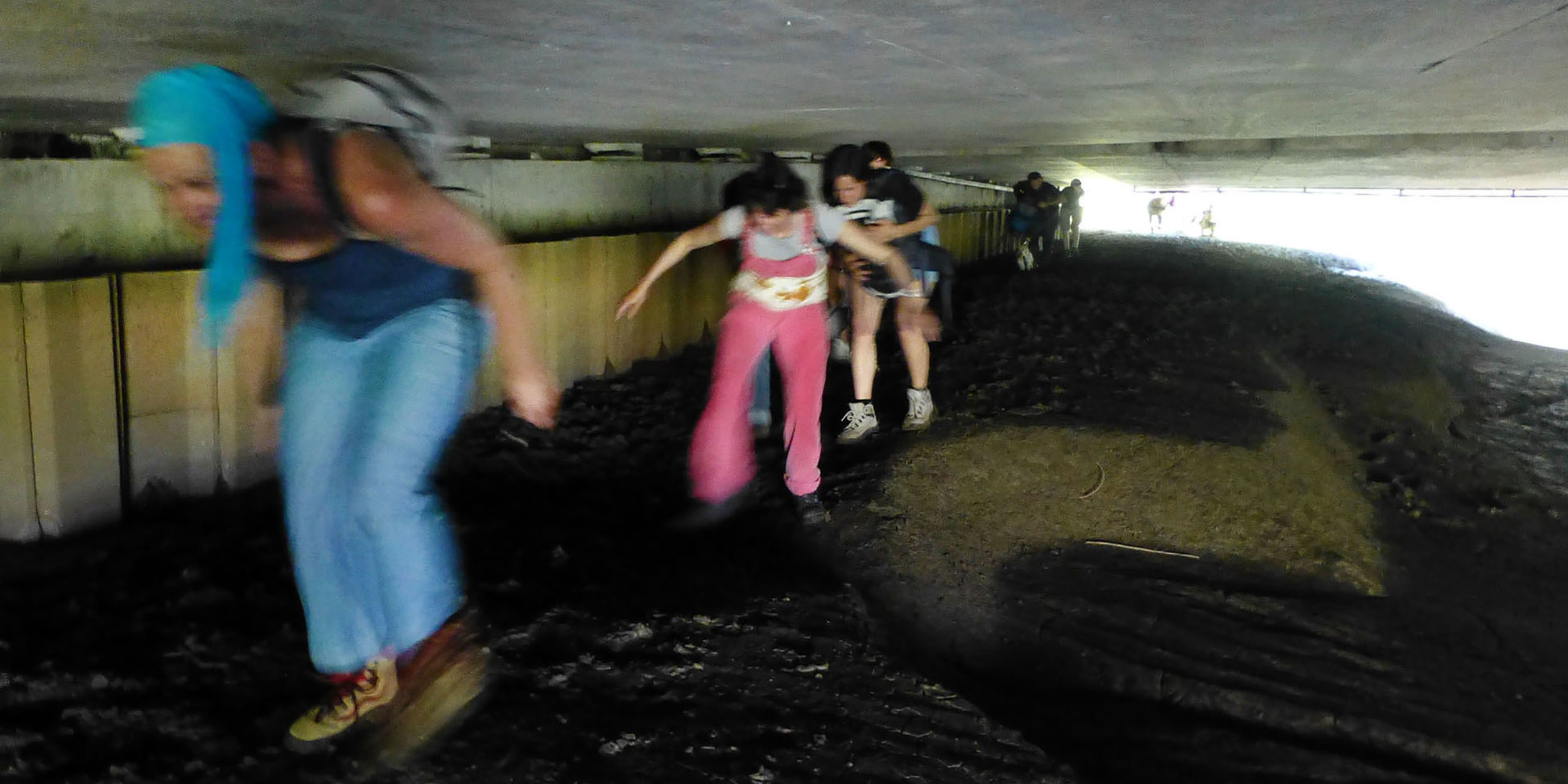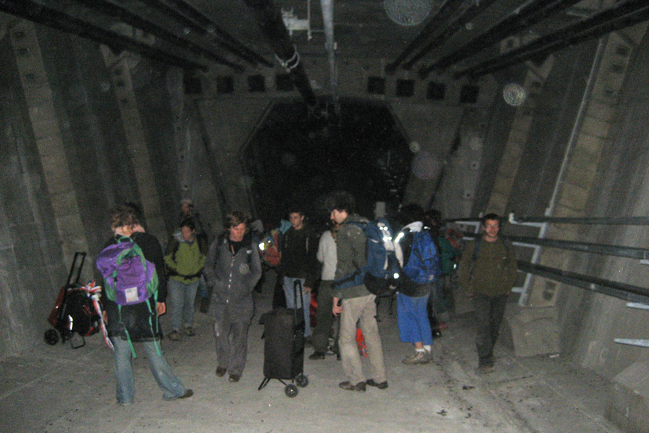 Un pique-nique périurbain organisé au pied du pont. Un porte de service laissée ouverte. Traversée nocturne du pont par l’intérieur du tablier de béton. Un chemin en sinusoïde. A chaque creux, un passage vers les piles et une petite plateforme au dessus de l’eau pouvant accueillir 4 à 5 personnes.vAu milieu du pont, un concert de contrebasse donné par un des participants.