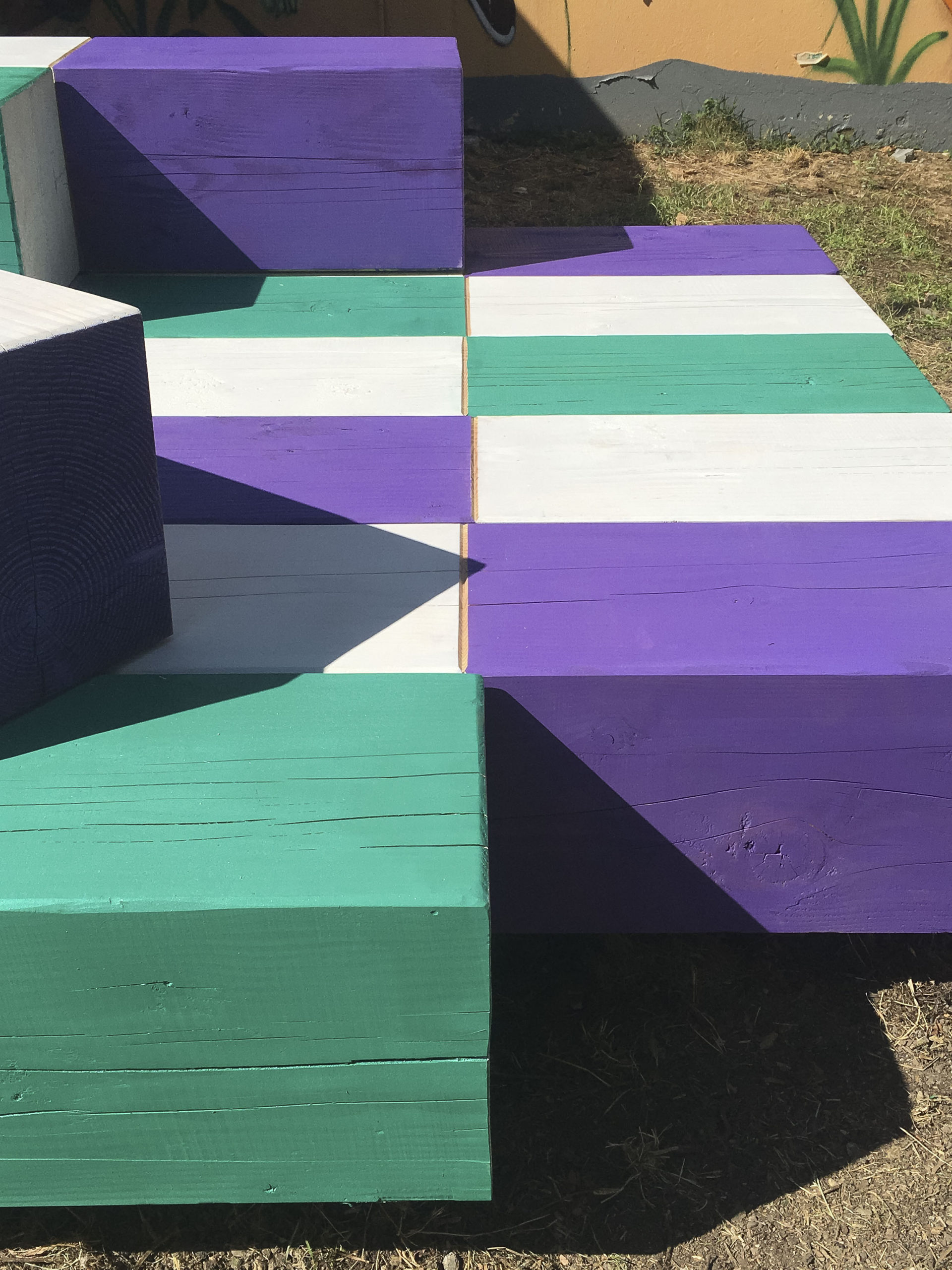 Des sucres géants en bois massifs peints, aux couleurs pastel qui reprennent l’esthétique d’une boîte de sucres emballés. Ces sucres assemblés deviennent des assises, une petite scène, un espace collectif, un mobilier ludique facilement appropriable par toutes et tous. Des messages au pochoir viennent apporter une dimension ludique et festive, en lien avec les données glanées lors des temps de rencontre.